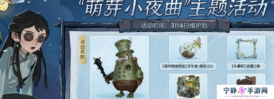 “萌芽小夜曲”主题活动将于3月6日维护后开启,访客们完成剧情演绎,即可获得【独特时装】26号守卫-原型机器人、【独特随身物品】求生者-萌芽之心、【家具】玻璃水培罐等活动奖励。