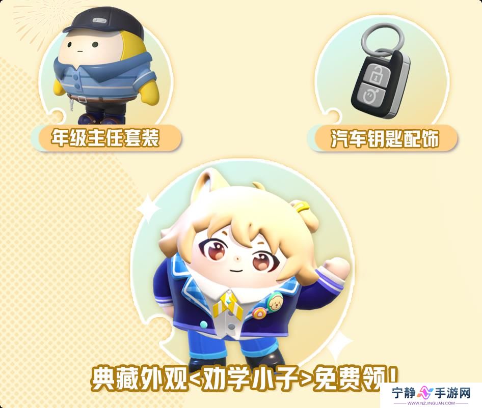 2月28日起,每周五—周日按时登录,即可免费抽取典藏外观<学小子>、套装<年级主任>、配饰<汽车钥匙>等奖励。