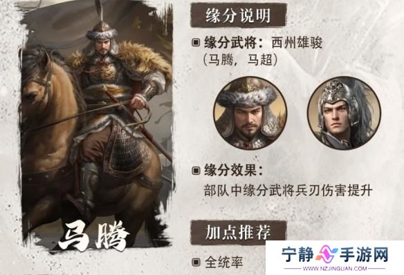 所谓“虎父无犬子,上阵父子兵”马腾之子马超亦是三国时期一员猛将,我们通过建立缘分“西州雄骏”,提升缘分武将的兵刃伤害,来体现他们在骑兵这一兵种上的优秀指挥才能。
