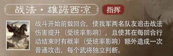 马腾起于微末,**入伍,累建军功,拥兵割据,凭借自己的军事实力与威望,成功控制了凉州地区,成为一方军阀,为此我们设计了战法“雄踞西凉”,效果为提升追击战法伤害,且有概率追加额外伤害,以突出他在凉州地区的统治地位和影响力。