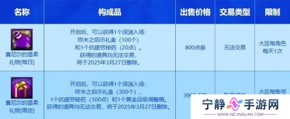赛尼尔的温柔礼物是新增的限定礼物活动,那么赛尼尔的温柔礼物活动内容是什么呢,活动期间将上架两个礼盒,其中一个限定礼盒一个大区每账号只能购买2次,每日礼物一个大区每个角色每天都能买一次,接下来本站小编给大家带来了详细的《地下城与勇士:起源》赛尼尔的温柔礼物活动介绍!