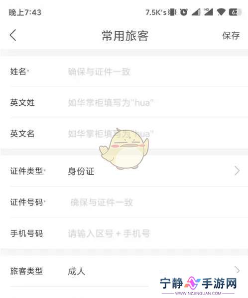 4、在常用旅客界面中,输入姓名,英文名和姓,证件号码,手机号码,邮箱,勾选我已阅读并同意《常用旅客信息授权协议书》,然后点击界面右上方的保存即可。