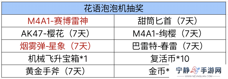而花语泡泡机环节,则是欧皇们的最爱。玩家可以通过浏览资讯、在动态专区评论以及分享活动来获取抽奖次数。奖池中的奖品琳琅满目,既有巴雷特-春雷、M4A1-绚樱等春日特色武器,也有全新推出的烟雾弹-星象以及经典返场的甜筒匕首等英雄级武器,让玩家充满期待。