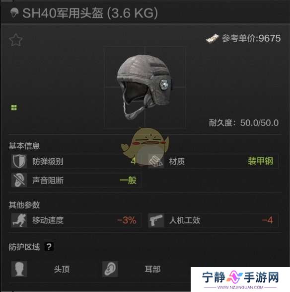 50耐久,头顶耳部防护,四级头当中最硬的头盔,材料是高贵的装甲钢,加装面罩可以达成头部四级全防,但问题在于会有一般等级的声音阻断,同时debuff较高,而且硬归硬,但再硬它也只是个四级头。