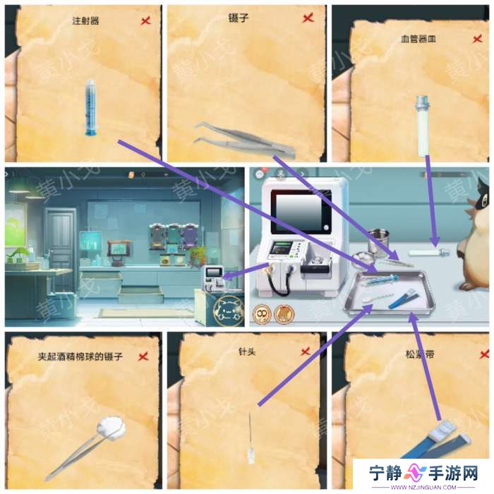 14.点击右侧桌子,获取抽血需要的工具(【注射器】、【镊子】、【血管器皿】、【针头】和【松紧带】,再用【镊子】夹取酒精棉,获得【夹起酒精棉球的镊子】)