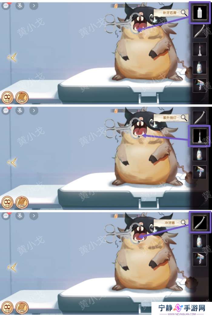 8.点击获取床上需要的工具(【紫外线灯】、【补牙石膏】、【撑牙器】、【镊子】和【冲牙器】)