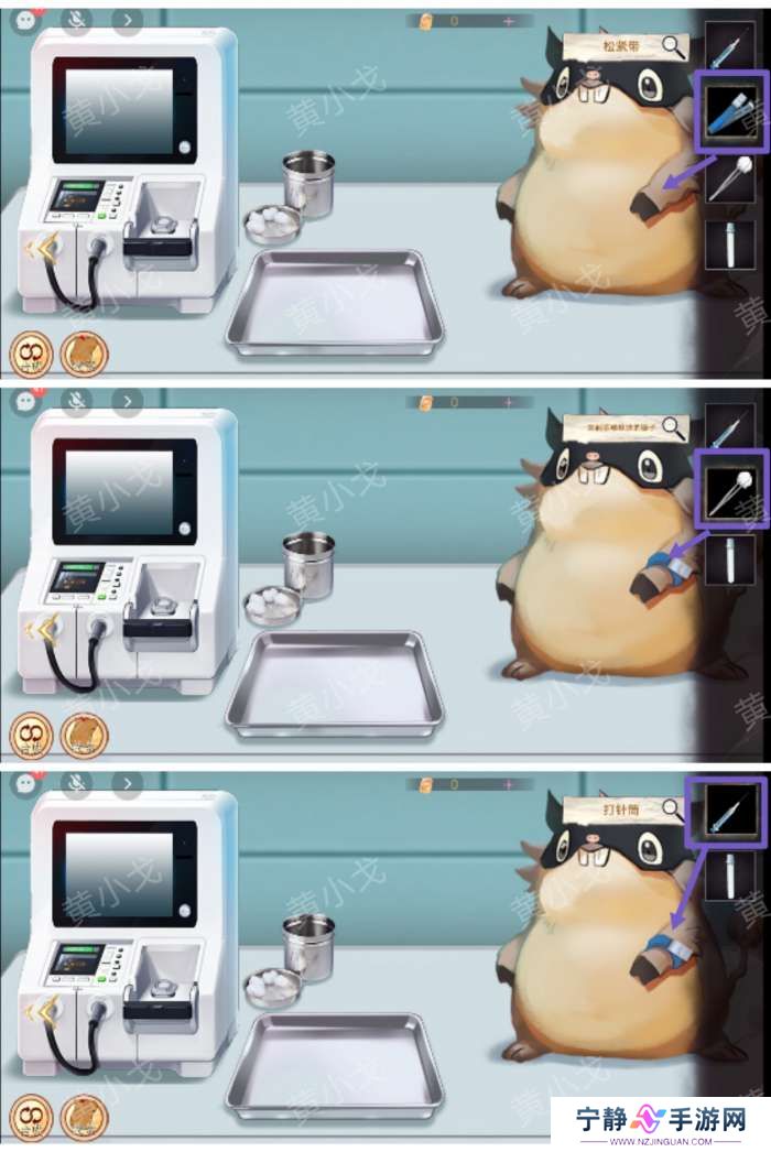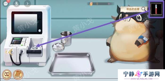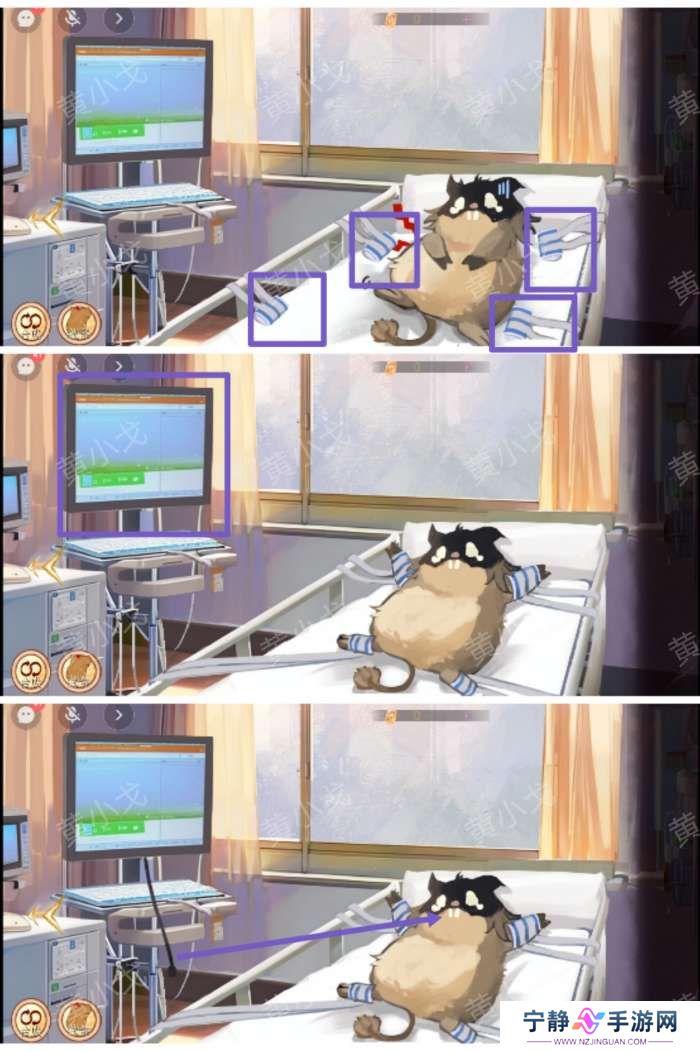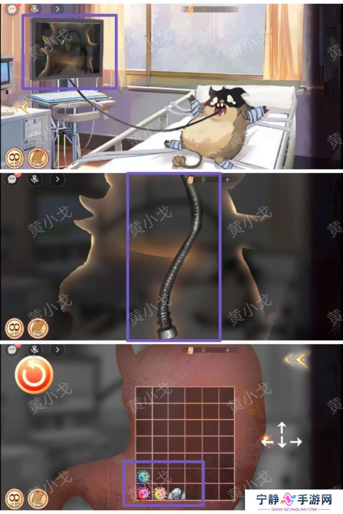 1.(病房)点击病床上四个角的束腹带将小猪鼠绑住;再点击胃镜仪器出现仪器管子;把仪器管子插入小猪鼠嘴巴