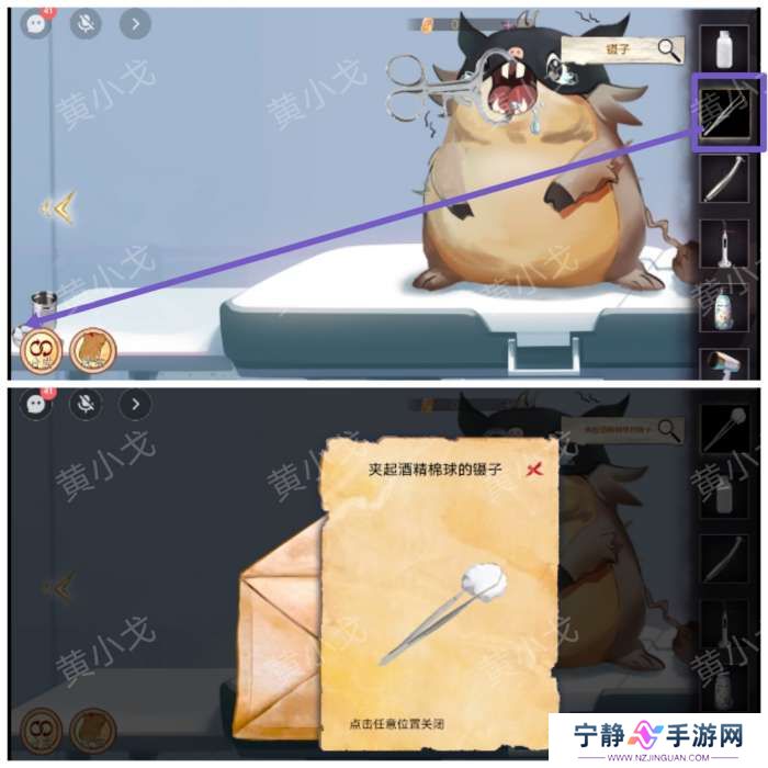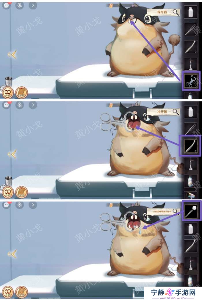10.用【撑牙器】把小猪鼠嘴巴打开,再用【冲牙器】冲干净,用【夹起酒精棉球的镊子】擦掉小猪鼠的口水