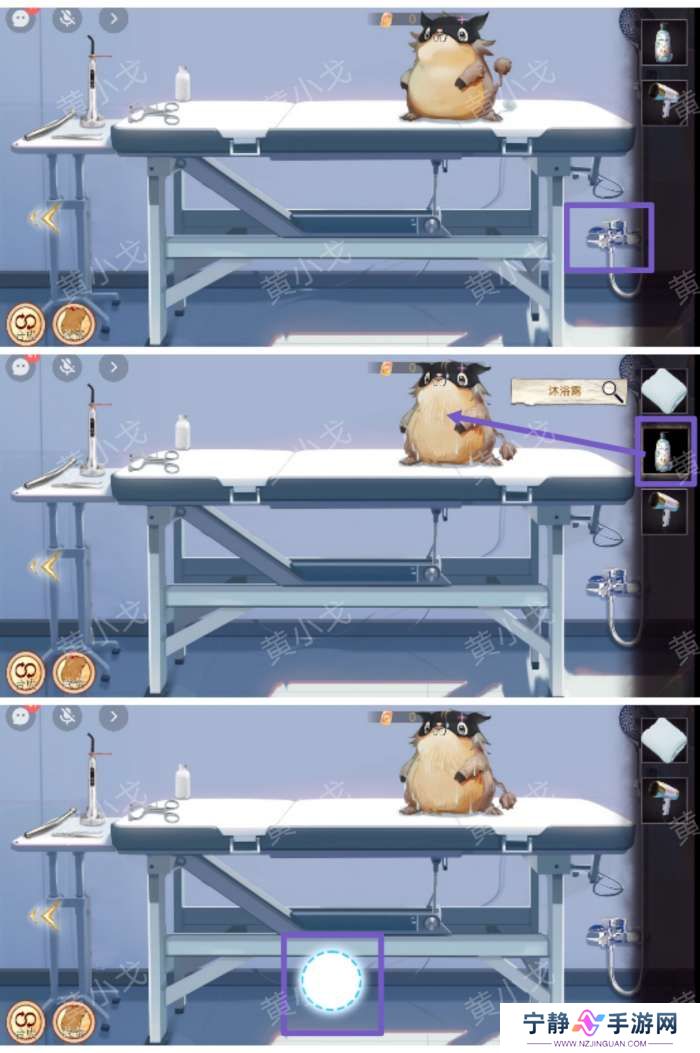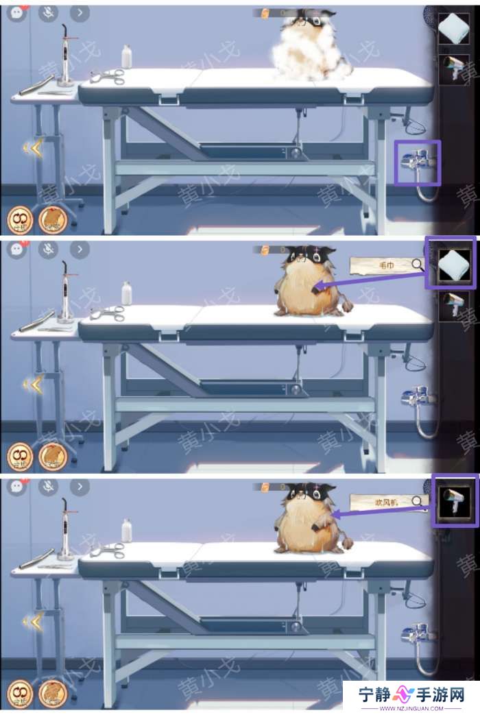 13.点击水龙头出水冲干净泡泡,用【毛巾】擦干水,再用【吹风机】把毛吹干