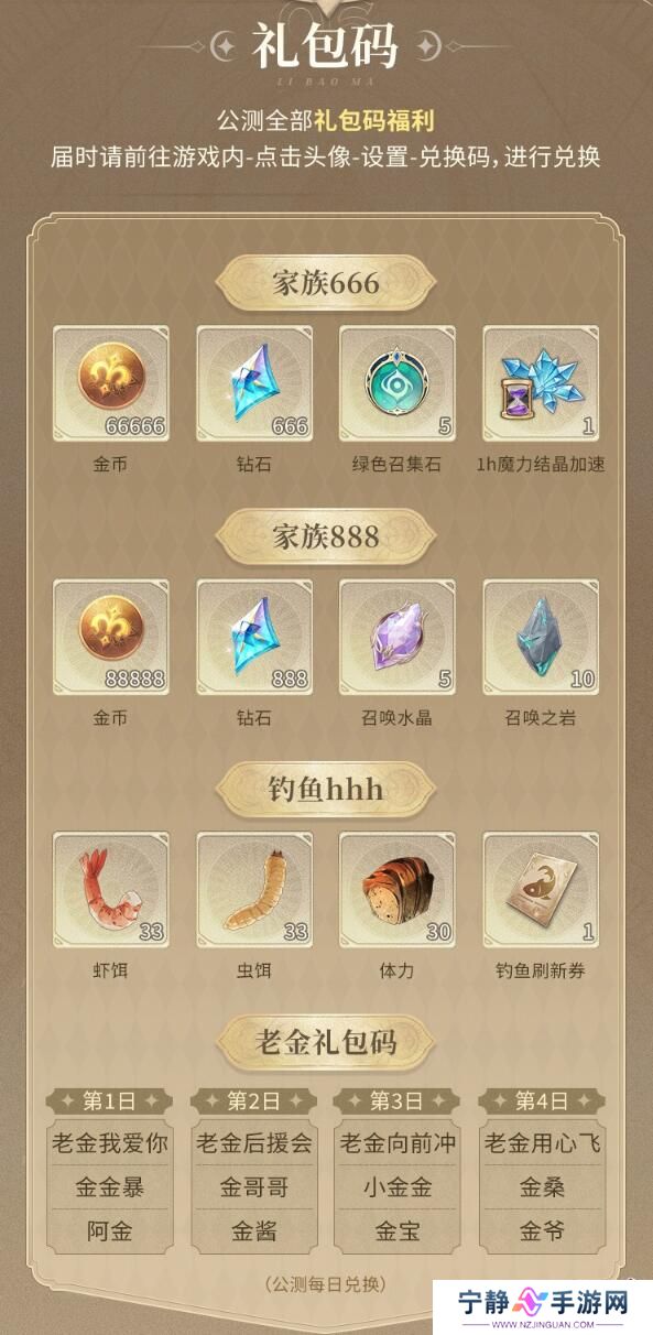 Ps. 老金礼包码是在公测前四天进行分天兑换,请各位祖宗大人们留意兑换开始时间噢