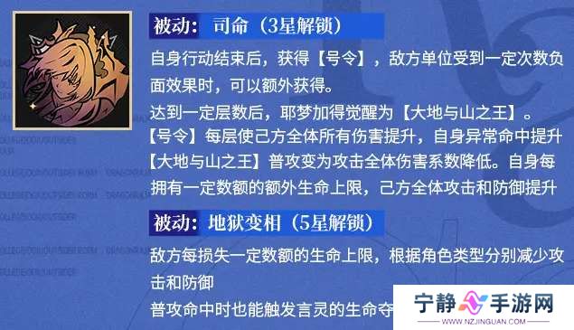 达到一定层数后,耶梦加得觉醒为【大地与山之王】。【号令】每层使己方全体所有伤害提升,自身异常命中提升【大地与山之王】普攻变为攻击全体伤害系数降低。自身每拥有一定数额的额外生命上限,己方全体攻击和防御提升。