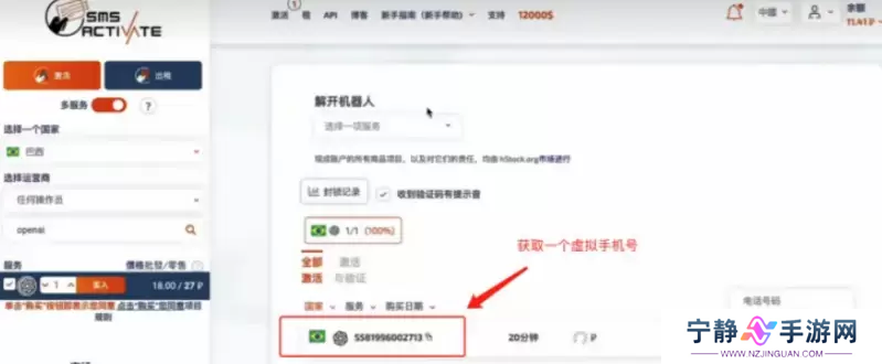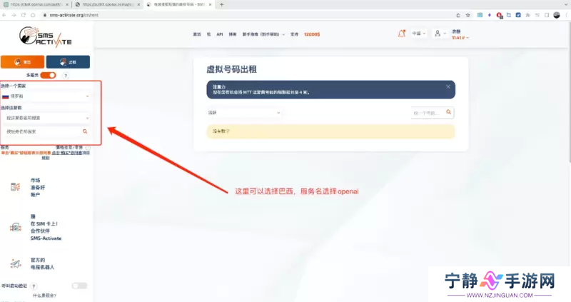 9、可以去租借虚拟号码,选择巴西,服务名选择[openai]。