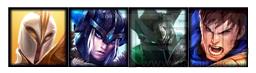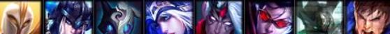 英雄分别为:薇恩、韦鲁斯、寒冰、千珏、铁男、盖伦、猪妹、天使。