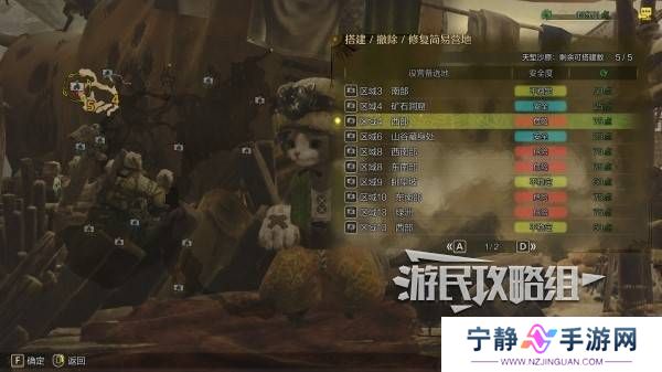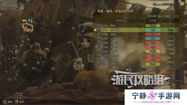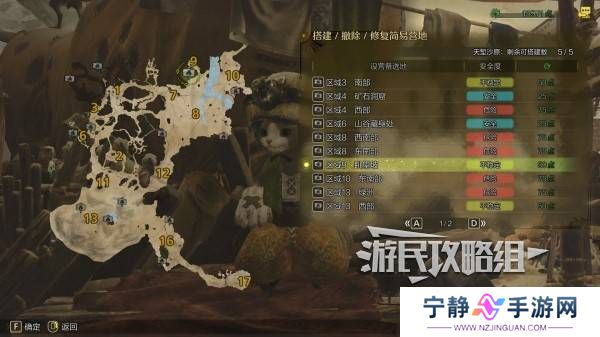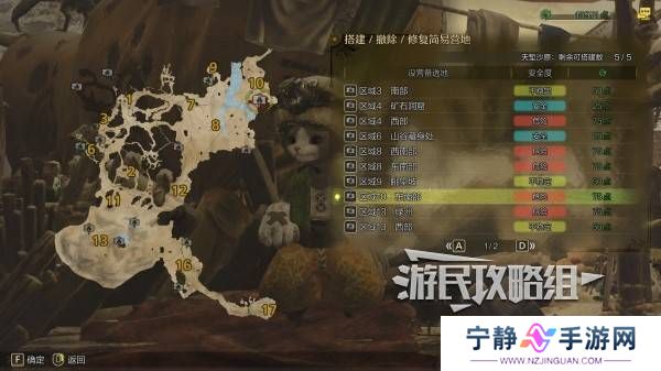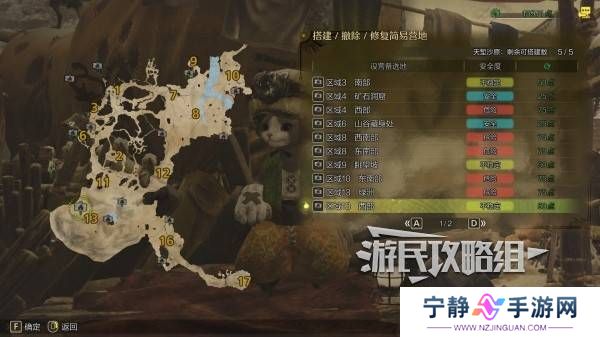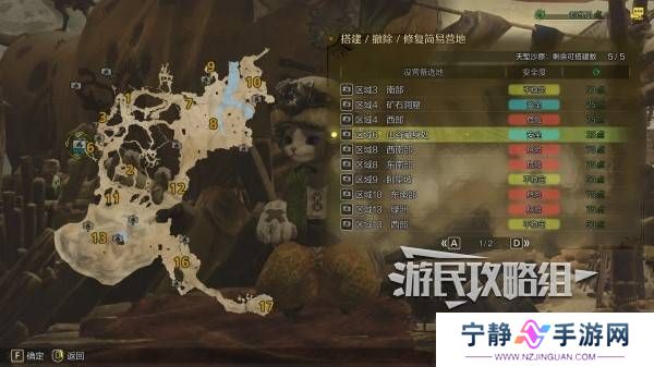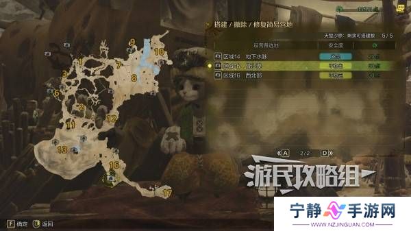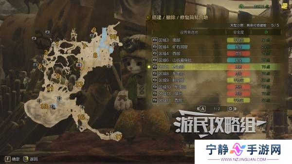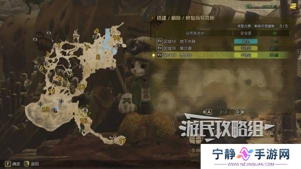天堑沙原地图上总共有13个简易营地,最多可搭建的数量会根据猎人等级提升而增加。推荐搭建营地位置为【区域4矿石洞窟】和【区域14地下水脉】,这两处位置比较安全,营地不容易被破坏;除此之外,还可以考虑在【区域16骨沙漠】搭建营地,这里是距离大本营最远的位置,但可能会被怪物破坏。如果有其他想要采集的矿产或素材,可以考虑在富集点附近的点位搭建简易营地,方便一次性刷完所需素材,哪怕之后营地被破坏掉也影响不大。